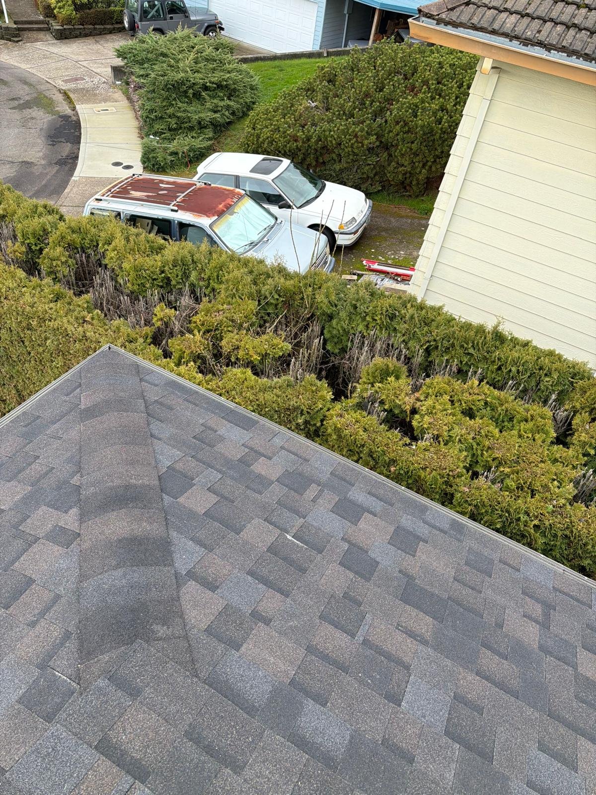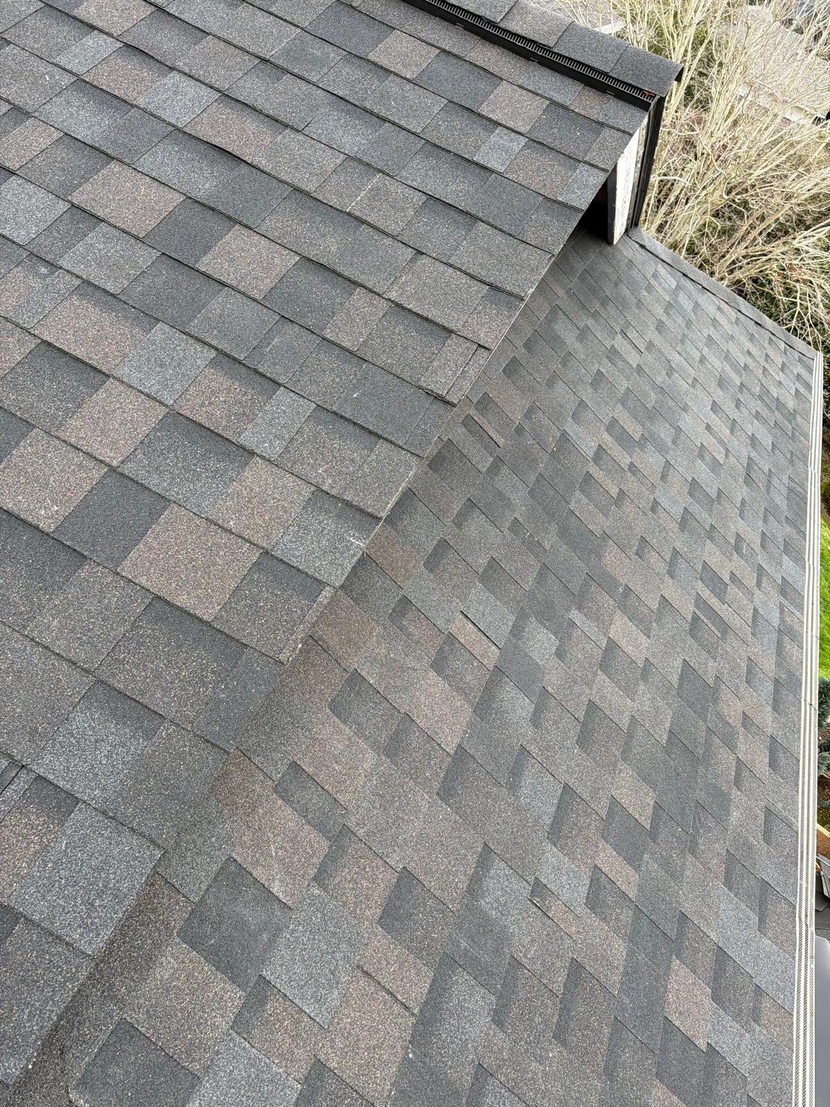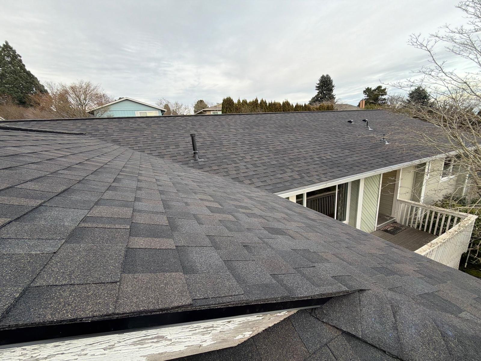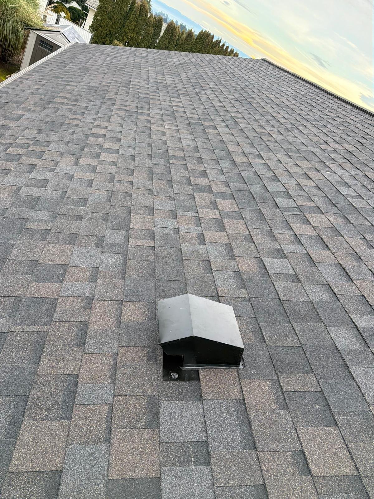 The roof deck was cleaned, old shingles and damaged wood were dismantled, and deteriorated plywood was replaced. A new waterproof barrier, asphalt shingles, vents, and piping were installed. Finally, gutters were cleaned and the surface was blown clean. Result: a renewed, functional, and clean roof.