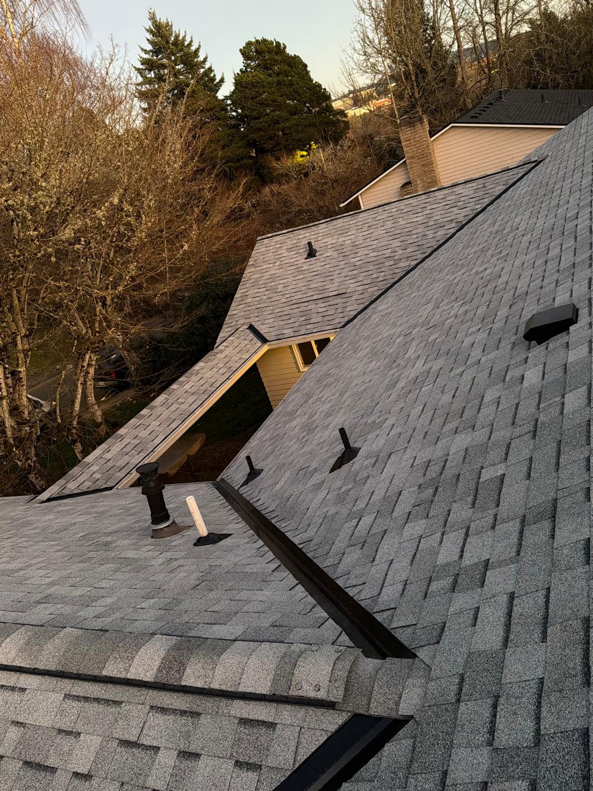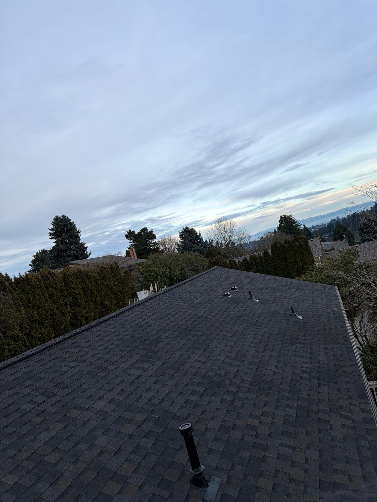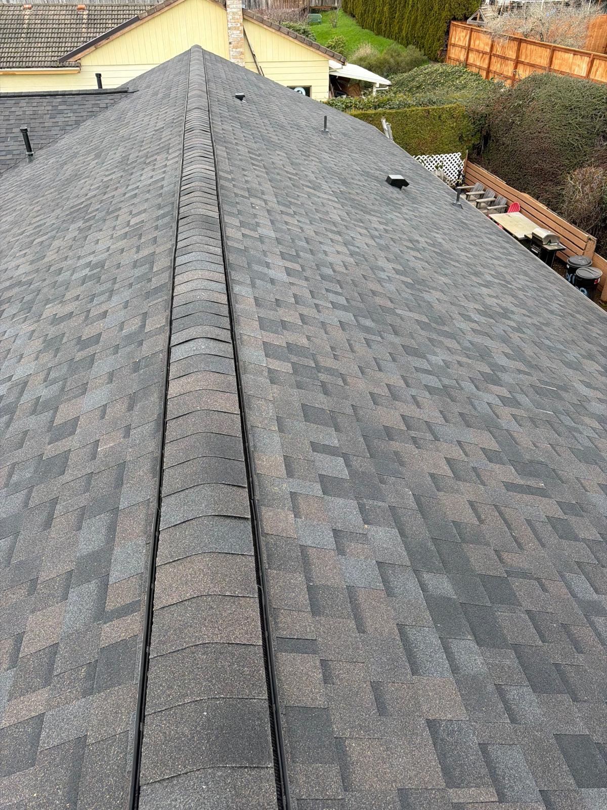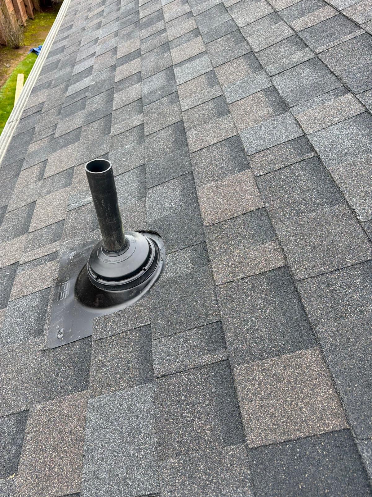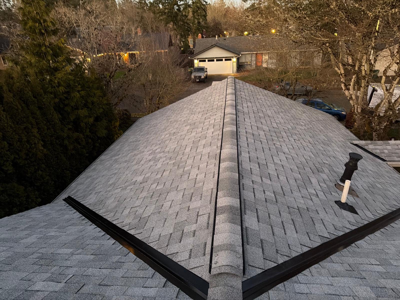 The roof deck was cleaned, old shingles and damaged wood were dismantled, and deteriorated plywood was replaced. A new waterproof barrier, asphalt shingles, vents, and piping were installed. Finally, gutters were cleaned and the surface was blown clean. Result: a renewed, functional, and clean roof.