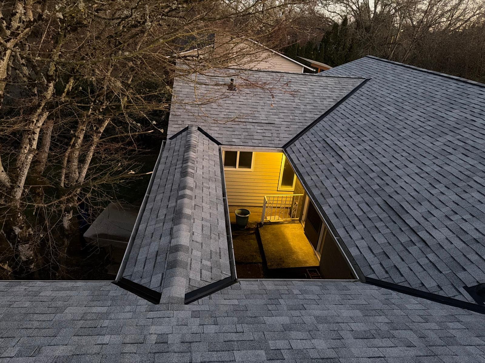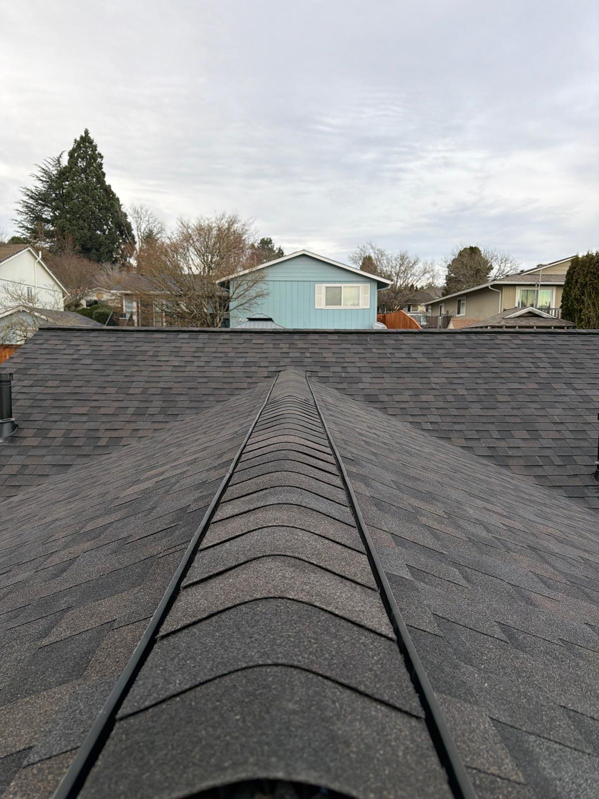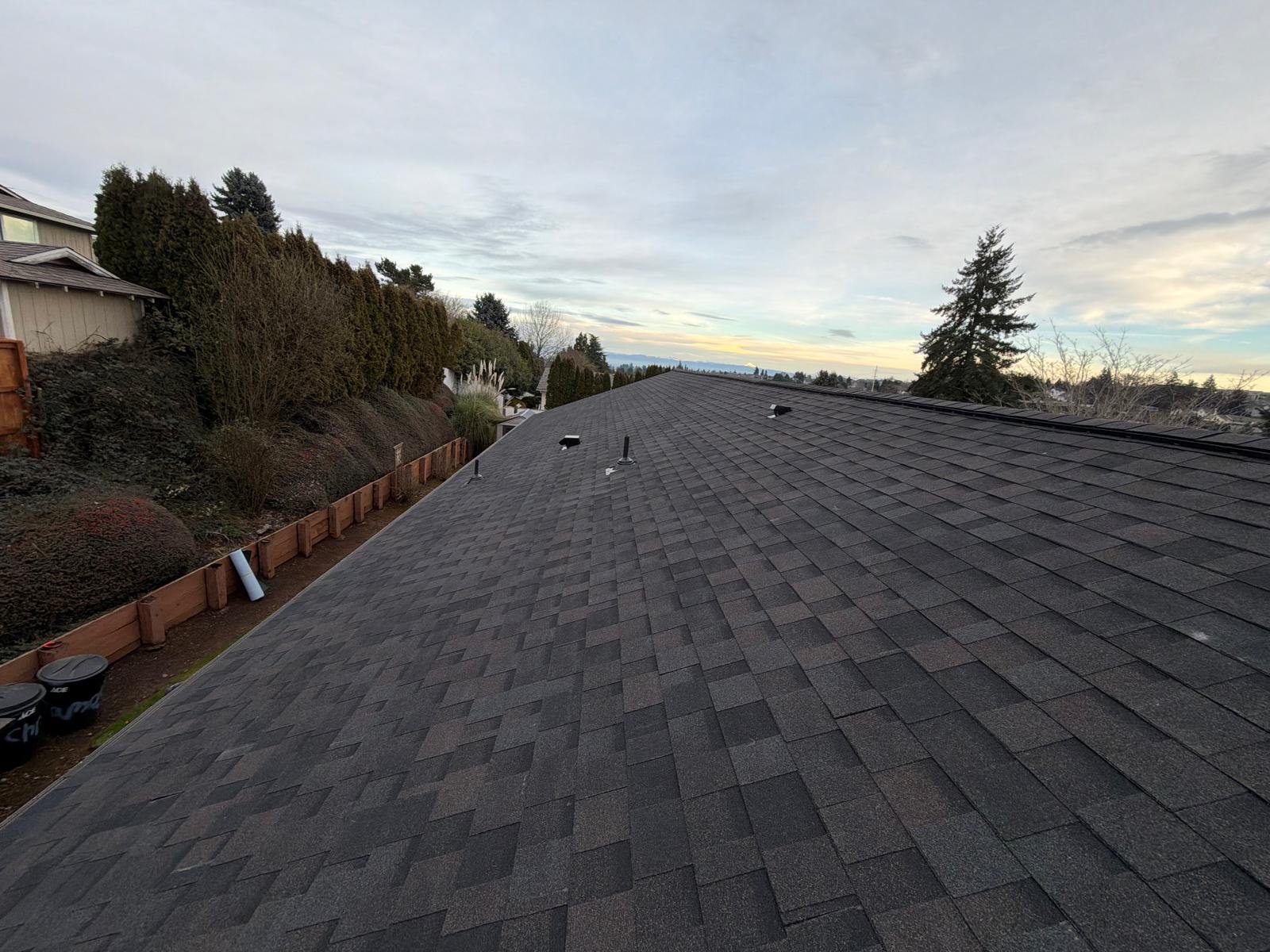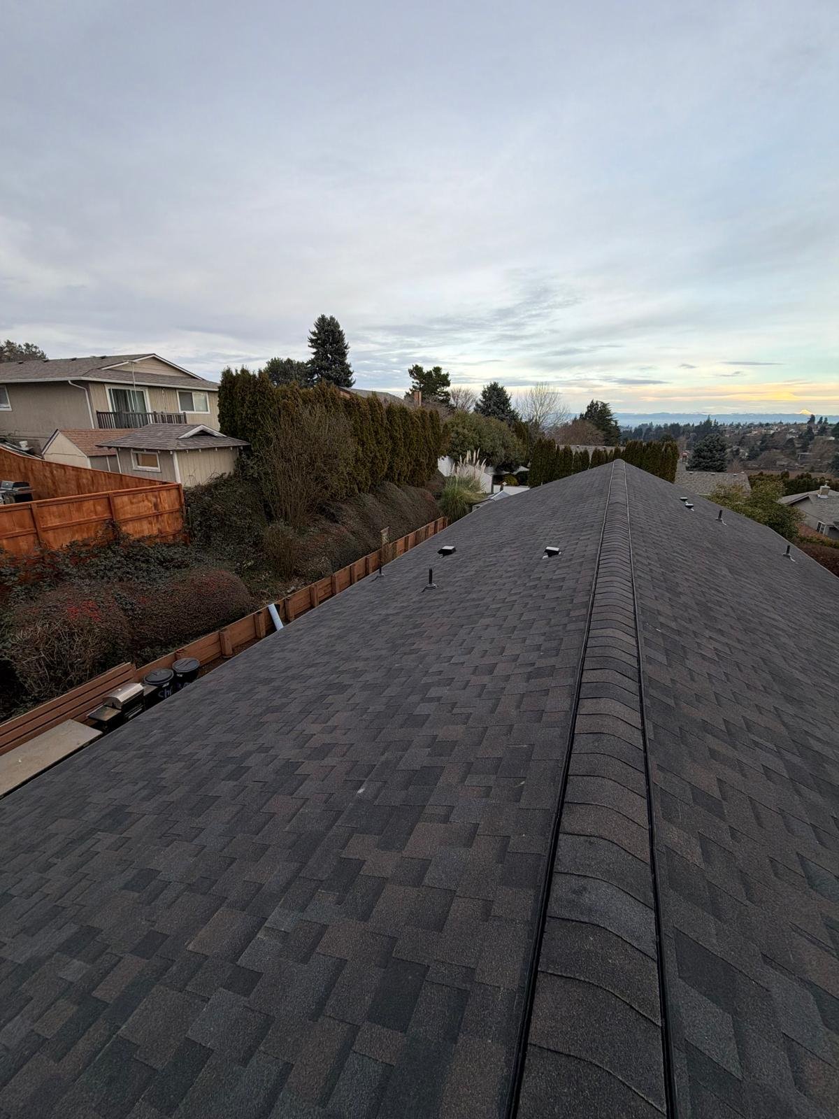 The roof deck was cleaned, old shingles and damaged wood were dismantled, and deteriorated plywood was replaced. A new waterproof barrier, asphalt shingles, vents, and piping were installed. Finally, gutters were cleaned and the surface was blown clean. Result: a renewed, functional, and clean roof.